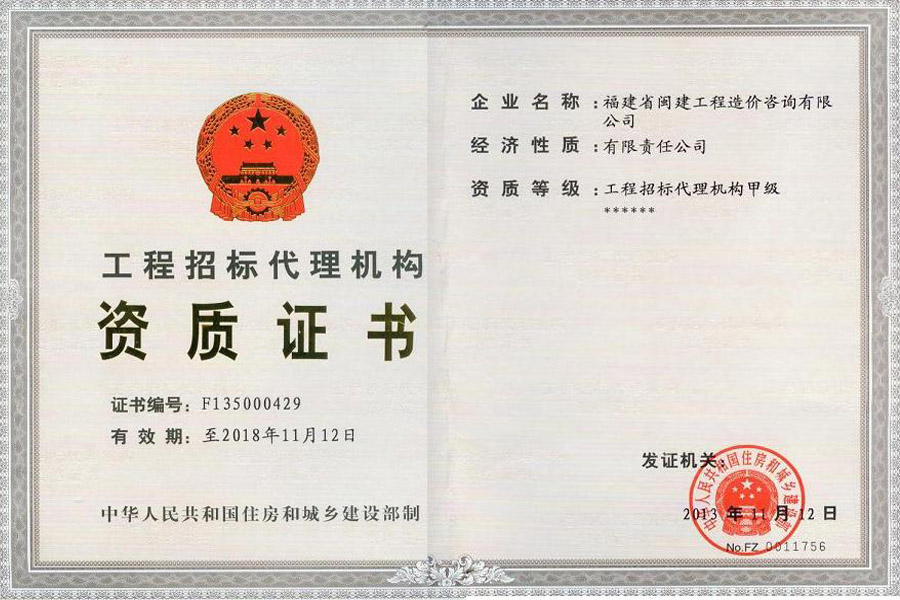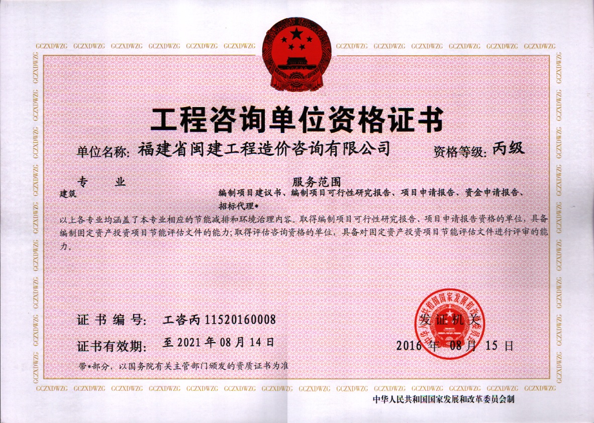 福建省閩建工程造價咨詢有限公司成立于1993年,原隸屬福建省建設委員會,2001年脫鉤改制為有限責任公司,公司注冊資本1200萬元,是一家具有甲級工程招標代理資質(zhì)(證書編號:F135000429)、甲級工程造價咨詢資質(zhì)(證書編號:甲150135000084)、政府采購代理資質(zhì)、預備級中央投資項目招標代理機構(gòu)資質(zhì)(證書編號:ZYTZ-C2013239)、丙級工程資質(zhì)(證書編號:工咨丙11520160008)的綜合性工程咨詢服務單位。能承擔各類建設項目的工程招標代理、工程造價咨詢...